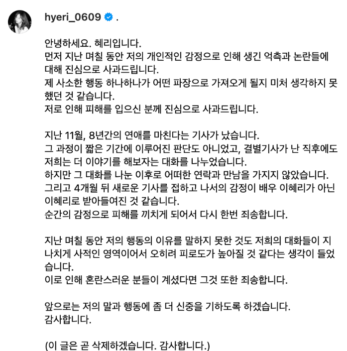 3월 18일 혜리 역시 인스타 사과문 올렸다.